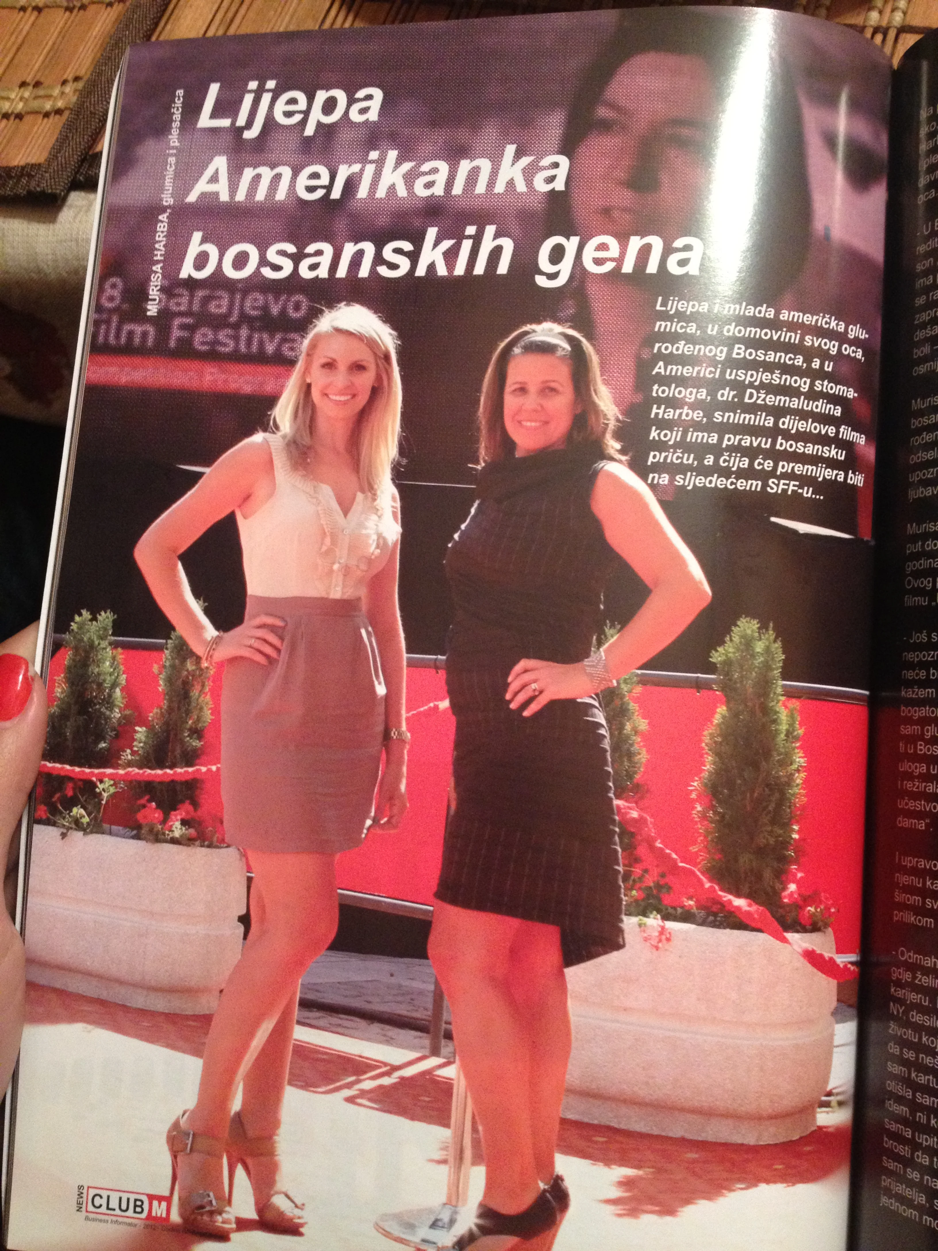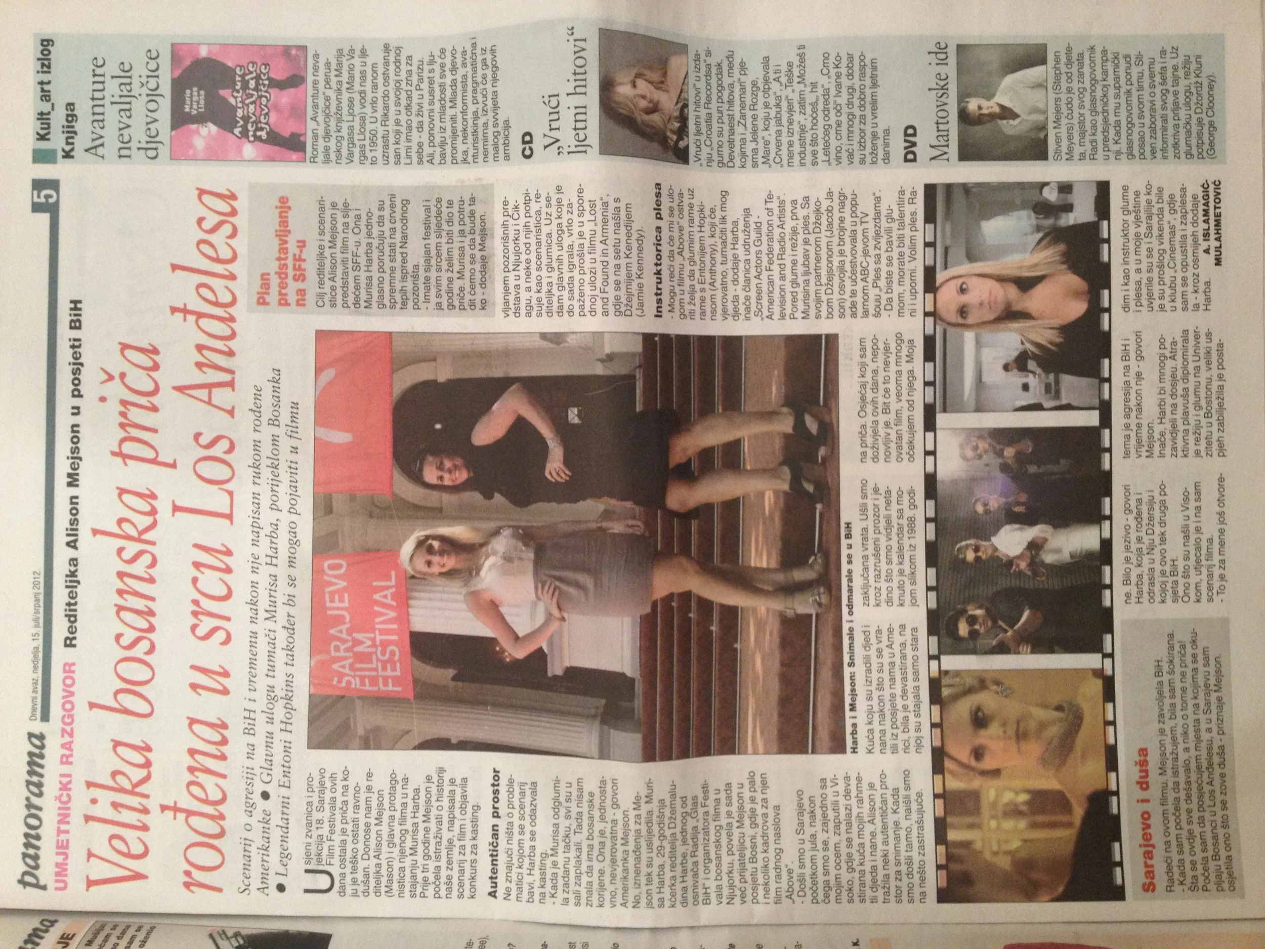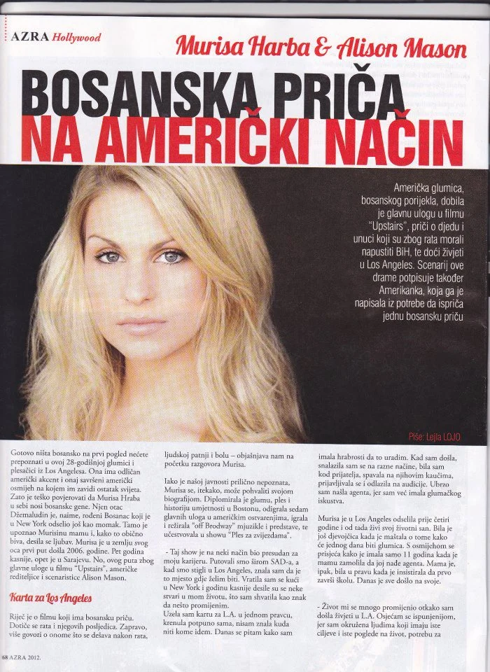 In 2012, Murisa with Director Alison Mason traveled to Sarajevo, Bosnia where they attended the Sarajevo Film Festival. They also shot footage in Murisa's late grandparents home town in which they created a proof of concept for upcoming feature UPSTAIRS, in which Murisa is slated to play the leading role. While in Sarajevo, they were interviewed by several publications, and did numerous television and radio appearances about the new film which is about a Bosnian young woman who escapes the Bosnian War with her grandfather and flee to Los Angeles and their journey to heal emotionally through the struggle of human connection.